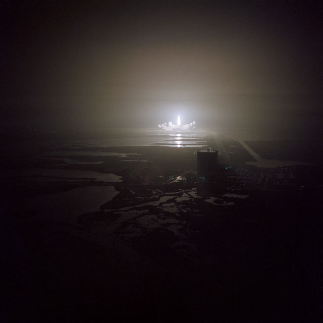 This nocturnal launch had been simulated on the ground. "We concentrated on flying night launches and night landings in a darkened simulator," Bluford recalled. "We learned to set our light levels low enough in the cockpit that we could maintain our night vision, and I had a special lamp mounted on the back of my seat so that I could read the checklist in the dark. The only thing that wasn't simulated was the lighting associated with the Solid Rocket Booster ignition and the firing of the pyros for SRB and External Tank separation."